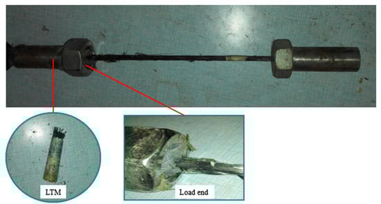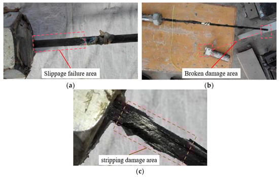 After the standard aging process, the ultimate load capacities of the three specimens were generally consistent, and the colloid maintained good adhesion integrity. As shown in Figure 7, the failure modes were identical for all the specimens exhibiting slip failure at the short anchorage end. This indicated that the experimental data were stable, and the results were reliable.