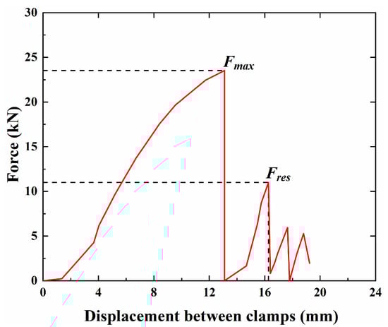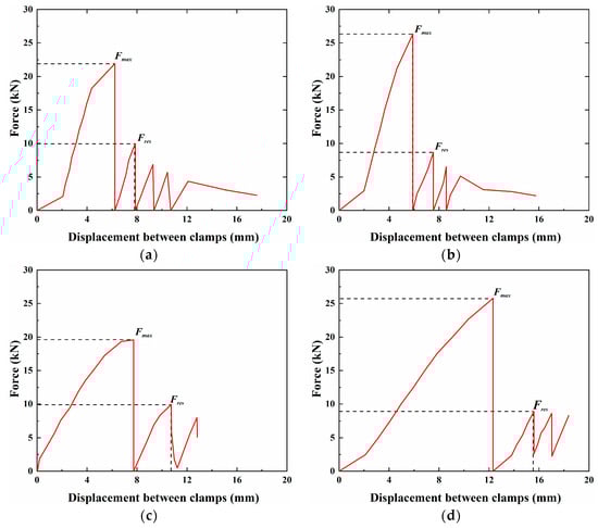 Figure 8 shows the pull-out force–displacement curve of a representative specimen (BS-t1-A). Before reaching the ultimate state, there was minimal relative slip between the CFRP anchorage and LTM. Upon reaching the ultimate state, a distinct cracking sound could be heard. Due to the universal testing machine’s inability to handle the sudden change in tensile force, the tensile force abruptly dropped to zero, causing the machine to automatically stop. After restarting the machine, the specimen continued to bear the load, but its maximum load capacity decreased compared to the initial stage. This peak force is referred to as the residual bonding force . Subsequently, the pull-out force–displacement curve exhibited a stepped shape, with the pull-out force decreasing as the slip increased.