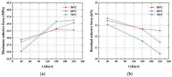 As shown in Figure 11 and Table 5, after 30 days of aging, the maximum bond strength showed a decreasing trend with the increasing aging temperature. The decrease was gradual in the 50 °C to 60 °C range and became more pronounced between 60 °C and 70 °C. In contrast, after 150 and 210 days of aging, the maximum bond strength increased with the rising temperature. This phenomenon was primarily related to the epoxy resin that was used as the bonding medium in the specimens. The epoxy resin was temperature-sensitive; thus, after 30 days of aging, its adhesive strength decreased with the increasing temperature. As the aging time increased, the polymer within the gel underwent an aging reaction, which increased its brittleness at room temperature, resulting in a higher shear strength. After 150 and 210 days of aging, the maximum bond strength stabilized.