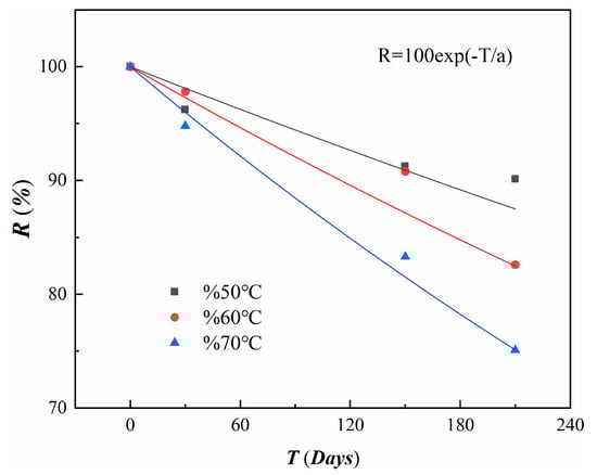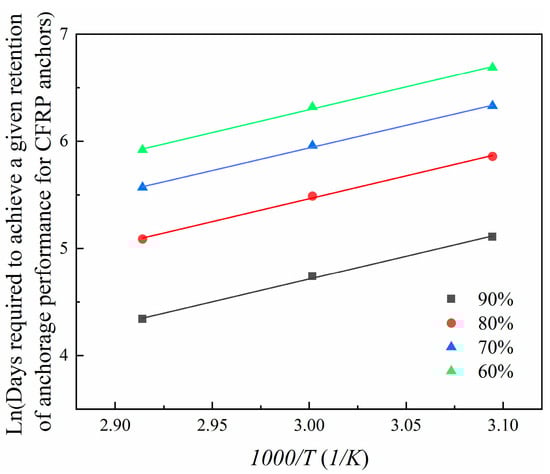 This experiment employs Equation (9) for degradation analysis, with the results shown in Figure 12 and corresponding parameters listed in Table 6. Under the conditions of 50 °C, 60 °C, and 70 °C, the degradation times that are required for the anchorage performance to reach retention rates of 60%, 70%, 80%, and 90% can be derived using Equation (9). Subsequently, data analysis is performed using Equation (7). As shown in Figure 13, the fitted lines are nearly parallel, consistent with the Arrhenius relationship. The slope , correlation coefficient , and constant are provided in Table 7.