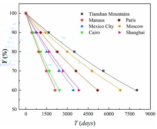 The retention rate curve for the CFRP anchorages is shown in Figure 14, with the corresponding coefficients and being presented in Table 9. According to the prediction results, the rate of decline in anchorage capacity for CFRP anchorages is fastest in the rainforest region represented by Manaus and slowest in the plateau mountainous region represented by the Tianshan Mountains. Table 10 summarizes the degradation data for CFRP cable anchorage devices after 10, 30, and 50 years in regions with average annual temperatures of 0 , 10 , and 20 . From Table 10, it can be seen that after 10 years, the degradation rates were 18.35%, 30.14%, and 44.5% for the 0 °C, 10 °C, and 20 °C regions, respectively. After 50 years, the degradation rates increased to 63.72%, 83.36%, and 94.73%. Therefore, the temperature significantly affects the long-term anchorage performance of CFRP cable bonding devices. In regions with higher temperatures, the design of the anchorage devices needs to be more conservative.