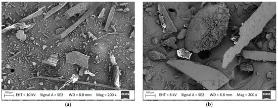 Pulverised (a) oat husks and (b) millet husks, SEM images, magnification 200×.