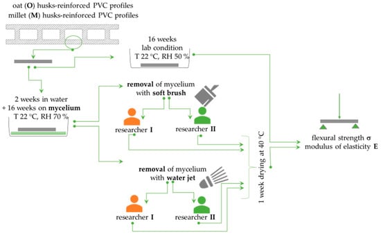 Mycelium removal was performed independently by two researchers with several years of experience in microbiological testing of building products. Each used two cleaning methods. Half of the samples from the given composite were manually cleaned using a brush. A soft nylon bristle brush with a diameter of 0.18–0.20 mm was used. The brush head measured 30 × 15 mm with four rows of fibre bundles arranged in 10 columns. The other half was cleaned using a water jet. A pressure washer (Kärcher, Poland, Kraków) was used. Water at 23 ± 2 °C was distributed using a lance at 12 bar pressure, at an intensity of 9.2 L/min. No detergent was used for either method. Cleaning was performed carefully until the mycelium was completely removed and visually controlled. After cleaning, all samples were dried for one week at 40 ± 2 °C in a forced-air laboratory dryer. Figure 3 shows the flowchart of the experimental steps.