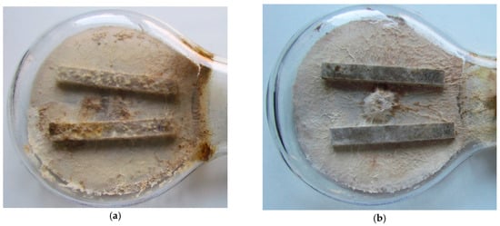 Differences in microbial activity are important in tests of resistance to biotic factors. This impact can be reduced by controlling the strain quality and culture conditions prior to test sample exposure [,]. The results can also be influenced by the method of mycelium removal as well as the methods used to assess the performance properties. During long-term exposure to fungi, mycelia tend to overgrow in the samples. The mycelium can be harmful to human health and interfere with the performance of the test equipment; therefore, it should be removed after completing the incubation and before further testing. This stage of the procedure is often overlooked in descriptions of test methods, including test standards []. Some authors have proposed a cleaning method. The samples can be cleaned with a soft brush [], pressurised water [], or sandblasting []. The test procedure for natural fibre composite fungal resistance [] has also not been fully defined in this area, which may lead to discrepancies in the results obtained by different laboratories.