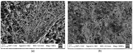 The surface of samples before mycelium removal was subjected to SEM analysis. It showed a developed mycelium with distinct spores (Figure 5a) characteristic for the Coniophora puteana strain. Mycelium images on the millet husk-reinforced composite were similar to those observed on the oat husk-reinforced composite. Due to the degree of mycelium development completely obscuring the composite, it was not possible to assess the surface morphology of the samples before cleaning. A brittle fracture test was also conducted to see if the mycelium enters inside the composite structure. The microstructure analysis showed that Coniophora puteana penetrates inside the walls of the profiles. In the images (Figure 5b), it is visible in the form of a dense network of thin threads, indicating that the fungus was present throughout the composite.