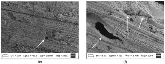 SEM analysis of the cleaned surfaces confirmed the macroscopic observations. The surface of both composites in the initial state had longitudinal grooves, in accordance with the mechanical treatment applied, but without exposing the filler (Figure 6a,b). After exposure to Coniophora puteana and removal of the mycelium with the brush in the case of the oat husk-reinforced composite, single, small fragments of filler particles not surrounded by the matrix became visible (Figure 6c). In the case of the millet husk-reinforced composite, large voids in the matrix with smooth surfaces (Figure 6d) were observed after the same cleaning process, indicating that interfacial bonds were lost, resulting in the removal of filler from the polymer matrix []. The surface morphology after water jet cleaning was similar (Figure 6e,f), with the millet husk composite showing filler loss of a smaller area than after brush cleaning. It was also revealed that there were non-matrix-covered millet husk particles. The above may indicate that not only the action of Coniophora puteana, but also the cleaning technique, is responsible for the filler loss.