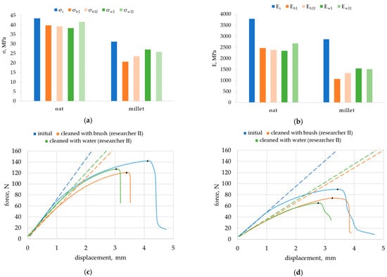 Test results of (a) flexural strength σ; (b) modulus of elasticity E of oat husk-reinforced composite and millet husk-reinforced composite in initial state (σi, Ei), after exposure to Coniophora puteana and cleaning with brush performed by researcher I (σbI, EbI) and by researcher II (σbII, EbII) or with water jet, also by researcher I (σwI, EwI) and by researcher II (σwII, EbII); (c) flexural test curves (examples) for oat husk-reinforced composite; and (d) flexural test curves (examples) for millet husk-reinforced composite;