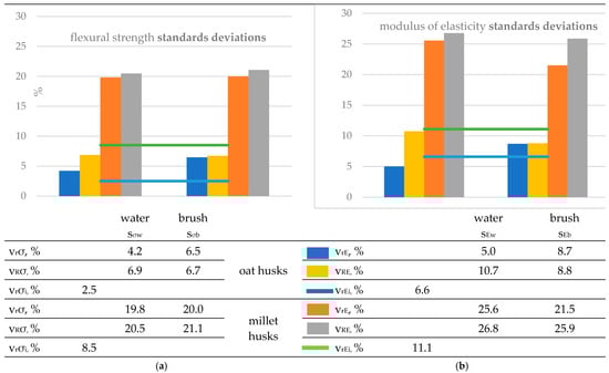 Values of repeatability and within-laboratory reproducibility coefficients of variation for millet husk-reinforced PVC composite and oat husk-reinforced PVC composite samples. vr- repeatability coefficient of variation, vR—reproducibility coefficients of variation, vrσi, vrEi repeatability coefficients of variation values for initial flexural strength and initial modulus of elasticity, respectively, and vYw, vYb-, values of coefficients of variation (vr and vR) for the Y quantity after exposure to fungi and cleaning with water jet and soft brush, respectively. (a) Flexural strength results and (b) modulus of elasticity results.