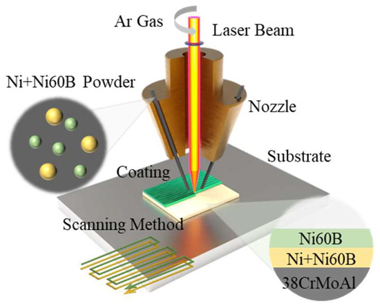 Nowadays, common surface modification technologies include electroplating [5], thermal spraying [6], arc cladding [7], and laser cladding [8]. Among these, laser cladding technology has received significant attention from researchers due to its advantages, such as concentrated heat input, excellent shaping controllability, lower dilution rates, minimal impact on the substrate microstructure, and a wide range of applicable material systems [8,9,10]. However, the high energy density of the laser generates a large temperature gradient in the manufactured sample, leading to significant internal stresses due to the rapid cooling rates. This makes materials like Ni60B, a high-hardness nickel-based self-fusing alloy, particularly susceptible to cracking, which limits the broader adoption of this technology [9,11].