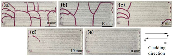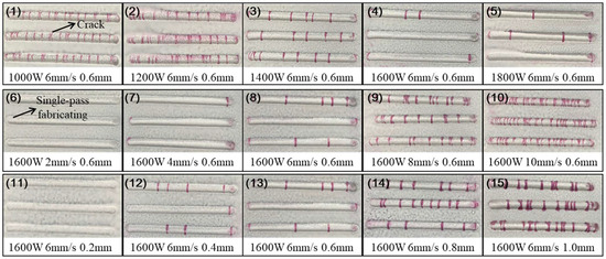 This section involved the investigation of the effect of process parameters on the cracking susceptibility of Ni60B coatings using single-pass single-layer experiments. A single-factor experiment was used to select representative process parameters to observe coating cracking. Specific combinations of process parameters are shown in Table 3. According to the parameters selected to carry out the laser melting fabrication experiments, the preparation of 50 mm single-pass single-layer specimens, the crack detection of each specimens, and the results of flaw detection by colouring are shown in Figure 4.