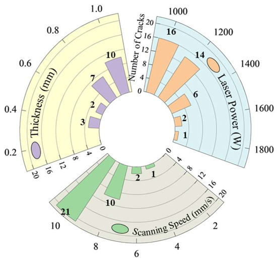 Through the coloring flaw map, statistics were made on the direction and number of cracks in the coating. It was observed that, under single-pass single-layer conditions, the cracking direction is perpendicular to the scanning speed. As for the number of cracks, Figure 4 shows that it varies with different process parameters. A statistical analysis of the average number of cracks for samples with varying process parameters is presented in Figure 5. The results indicate that, while maintaining a constant layer thickness, an increase in laser power leads to higher heat input, resulting in a significant reduction in the number of cracks. Conversely, as the scanning speed increases, the heat input decreases, causing a marked increase in the number of cracks. This is because increased heat input and prolonged molten pool duration improve fluidity, reduce the temperature gradient, slow the solidification rate, lower residual stresses, and thus decrease crack susceptibility in the coating [26]. When laser power and scanning speed are kept constant, but layer thickness is varied, an increase in layer thickness leads to more pronounced cracking. This occurs because thicker coatings require more heat to melt the powder, reducing the melt time and fluidity, increasing the temperature gradient, and elevating residual stresses, all of which heighten the coating’s susceptibility to cracking [27].