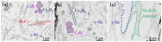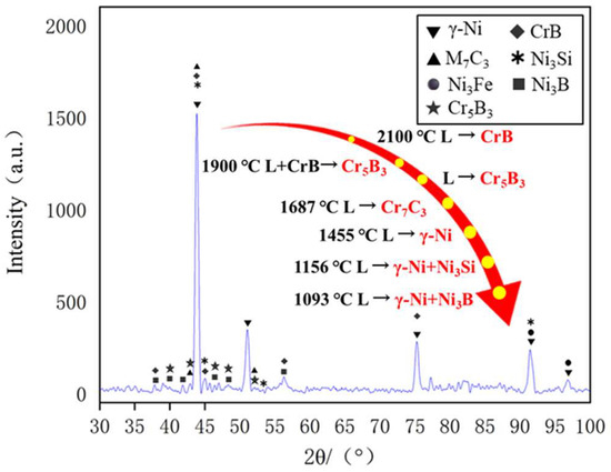 The Ni60B sample was subjected to X-ray diffraction (XRD) spectroscopy as shown in Figure 8. Combined with existing research, the main phases of Ni60B coatings can be deduced from comparative analyses to be γ-Ni, M7C3 (M=Cr, Fe and Ni), Ni3B, Ni3Fe, Ni3Si, CrB, and Cr5B3 [12,25,28]. Hard phases such as Cr-borides and carbides are first formed in the cladding layer, and Ni dendrites and Ni-Cr-B eutectics grow with the decrease in molten pool temperature [29]. As shown in the references, CrB, Cr5B3, and Cr7C3 hard phases are first precipitated in the molten pool [29,30], where Cr5B3 can be precipitated both directly from the molten pool and indirectly through inclusion reactions. Subsequently, γ-Ni solid solution is formed in the molten pool, and finally two eutectic microstructures, Ni-Ni3Si and Ni-Ni3B, are produced by eutectic reaction.