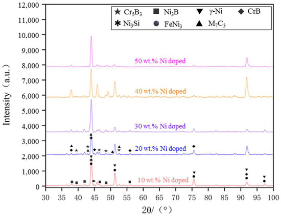 Figure 12 presents the XRD spectra of the coatings with varying levels of Ni doping. By analyzing the X-ray diffraction (XRD) spectra under different conditions of Ni doping, it is evident that the main phases of the coating consist of γ-Ni, M7C3 (M=Cr, Fe, Ni), Ni3B, Ni3Fe, Ni3Si, CrB, and Cr5B3. The positions of the diffraction peaks for the coating phases under various transition conditions remain largely consistent, with differences observed only in the intensity of some peaks. An analysis of the XRD spectra suggests that the main phase composition of the cladding layer is similar across different transition schemes, indicating that the transition method effectively preserves the material’s inherent phase properties.