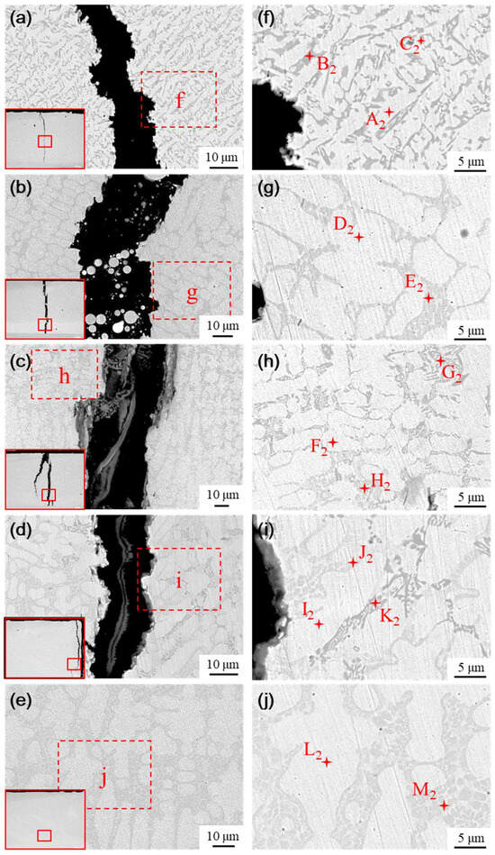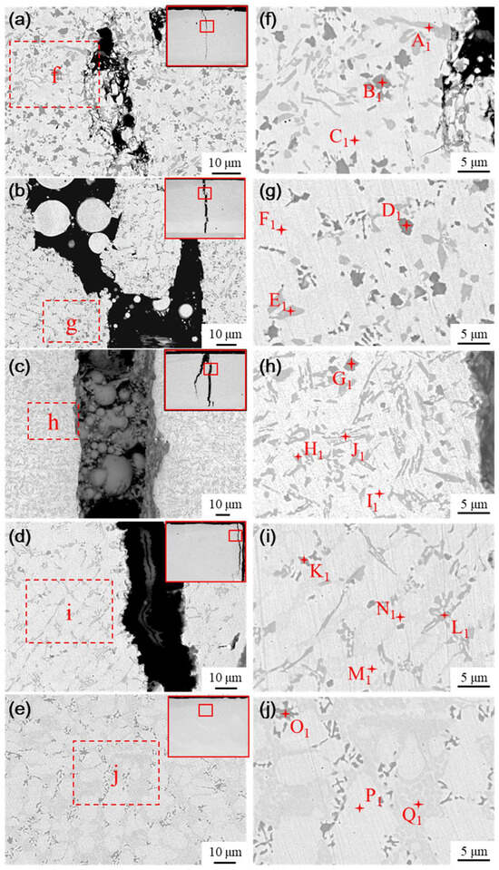 A longitudinal section perpendicular to the crack location was taken and the microstructure of the Ni60B coating was observed by scanning electron microscopy (SEM) at the top, middle, and near the bottom of the Ni60B coating, as shown in Figure 9a–d. And the EDS test results are shown in Table 5. The upper and middle parts of the coating are mainly composed of a black solid phase, a gray irregular stripe phase, a gray butterfly phase, and a white basal phase, while the lower part of the coating is mainly composed of white and gray basal phases, and the black, and gray precipitate phases appearing in the upper and middle parts of the coating are not seen. The main constituents of the massive black phase (point A and point D) are Cr and B, and the atomic ratio is close to 1:1, so the black precipitation phase is CrB. The irregular bar phase (point B) is dominated by Cr and C as the main constituent elements but also contains high amounts of Ni and Fe. The reason is that Ni (0.352 nm), Cr (0.288 nm), and Fe (0.287 nm) atoms have very similar atomic radii, and they are very easy to exchange with each other [31], and it can be deduced that the gray phase is M7C3 (M=Cr, Fe and Ni). The main constituents of the gray butterfly phase (point E) are Cr and B. Combined with the atomic ratio, it can be deduced that this gray phase is Cr5B3. The white basal phase (point C and point F) is mainly dominated by Ni and Fe elements, and this basal phase is a γ-Ni solid solution. As a result of the laser cladding process, some of the elements in the substrate are diluted into the coating, making the bottom of the coating rich in Fe elements. Excessive Fe elemental content inhibits the precipitation of hard phases such as incipient borides, resulting in the presence of only two basal phases, white and gray [32]. Combining Fe and Ni elements with good mutual solubility [31], the white basal phase is the γ-Ni solid solution. And the gray basal phase is the Ni-B-Si eutectic microstructure composed of Ni3Fe, Ni3B, and Ni3Si. The high content of element B in the molten pool initially develops a hard boride phase with a high melting point during solidification [12]. The remaining B element is not enough to form a large amount of the Ni-B-Si eutectic microstructure, which in turn leads to the absence of obvious Ni-B-Si eutectic in the top and middle parts of the Ni60B coating.
