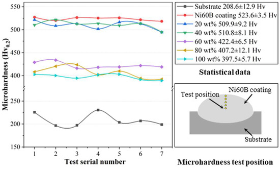 - The average microhardness of the Ni60B coating directly formed on the substrate reached 523.6 ± 3.5 HV0.2, which is 2.5 times higher than the 208.6 ± 12.9 HV0.2 of the substrate. After adding the transition layer, the microhardness decreased with increasing Ni elements in the transition layer; when Ni < 40 wt.%, the top Ni60B coating microhardness reached 509.9 ± 3.5 HV0.2. However, when Ni > 60 wt.%, the microhardness of the top Ni60B coating decreased from 422.4 ± 6.5 HV0.2 to 397.5 ± 5.7 HV0.2, showing an improvement of over 91% in microhardness compared to the substrate.