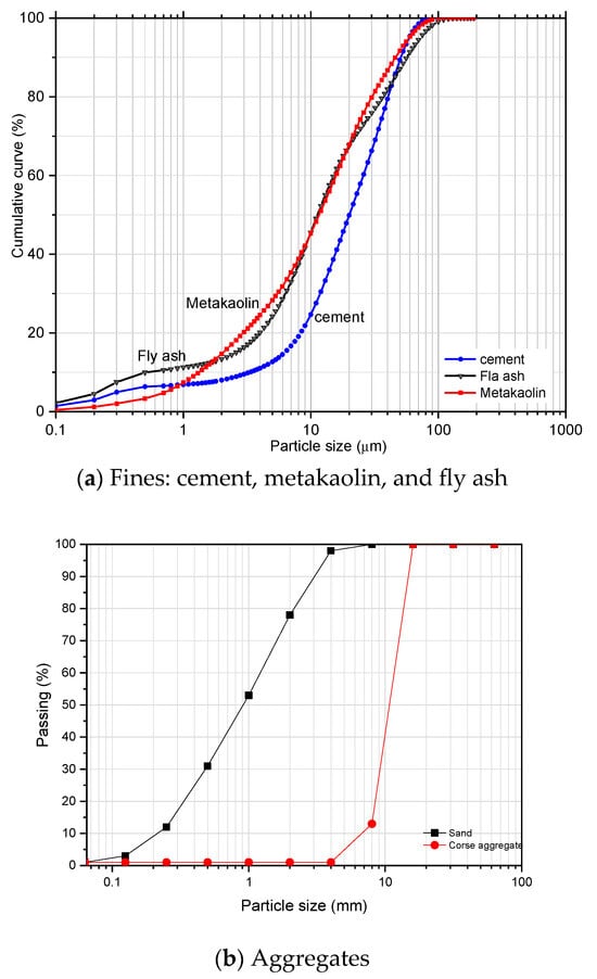 Portland cement CEM I 42.5R (C), Class B fly ash (FA) complying with EN 450-1 [45], metakaolin (MK), and hydrated lime (HL) commercials were used as binders. We also used a coarse crushed aggregate from a granite quarry (G) (Dmax = 16 mm), a fine natural river aggregate (S) (Dmax = 4 mm), tap water (W), and a polycarboxylate-based superplasticiser (SP). The particle size distributions of the materials are shown in Figure 1. More details about the chemical analysis and particle size distribution curves of cement, hydrated lime, metakaolin, fly ash, and aggregates used in this research can be seen in the studies by Anjos et al. [43,44]. Table 1 presents the chemical composition in terms of the oxide of the materials used as binders that will be used in Section 2.2 to calculate the percentages of calcium oxides and silicon dioxide in each of the cement mixtures.