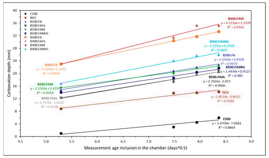 The relationship between carbonation depth versus the square root of the time spent in the carbonation chamber.