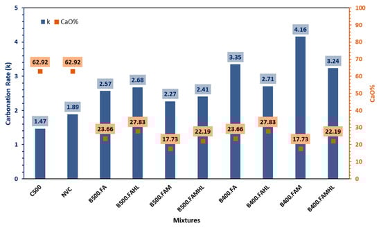 Considering the important role of CaO in this context, Figure 3 shows a correlation between the k and the CaO content present in the concretes studied. It is observed that the lower the CaO content present in the SCC binders, the lower the CHfree content and consequently the greater the depth of carbonation.