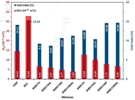 Considering the close relation between the chloride migration coefficient (DCl) and the void index, these results are shown together in Figure 4 at 90 days (when the pozzolanic reactions are relevant). Regarding the chloride migration coefficient, it is evident that all SCCs with partial replacement of cement by SCM (binary, ternary, and quaternary) presented lower diffusion coefficients when compared to SCCs with only cement as a binder, even the one produced with a high cement content, C500 (500 kg/m3). Regarding the avoid index, the relation is similar, except for B400.FAM and B400.FAMHL, which have a higher avoid index than C500.