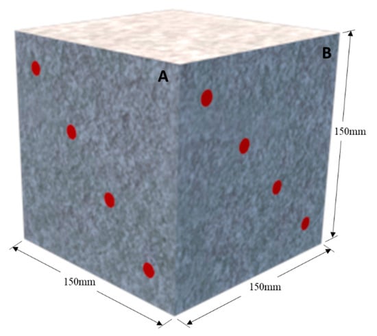 The electrical resistivity measurements were carried out according to Figure 5. Four measurements were carried out on the diagonal of the specimen and perpendicular to each other on two distinct concrete surface faces (A and B). The average electrical resistivity value is shown in Figure 6. The figure is divided into four corrosion risk ranges, as suggested by Andrade and Alonso [70]: >100 kΩ·cm (negligible); 100–50 kΩ·cm (low); 50–10 kΩ·cm (moderate); and <10 kΩ·cm (high).