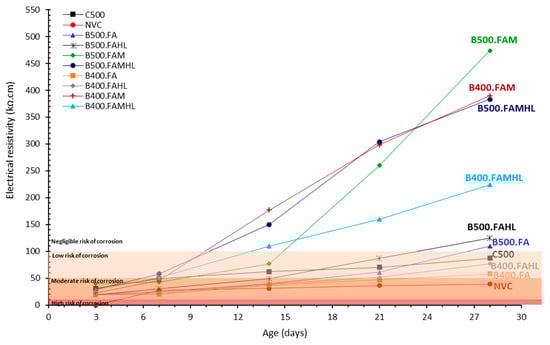 Electrical resistivity describes the ability of concrete to oppose the movement of ionic currents through its medium. Consequently, higher resistivity helps to inhibit the chances of corrosion in concrete; when resistivity increases, the rate of corrosion decreases [72]. In this sense, considering the 28 days of age, it can be seen that most of the SCCs with the partial replacement of cement show a risk of corrosion between low and negligible according to the ranges suggested by Andrade and Alonso [70]. All SCCs with 500 kg/m3 of binder and partial replacement of cement (B500.FA, B500.FAHL, B500.FAM, and B500.FAMHL) and two SCCs with 400 kg/m3 of binder (B400.FAM and B400.FAMHL) present a negligible risk of corrosion (>100 kΩ·cm). The B400.FA, B400.FAHL, and C500 present a low risk of corrosion (50 to 100 kΩ·cm). Only the NCV presents a moderate risk of corrosion at 28 days (10 to 50 kΩ·cm).