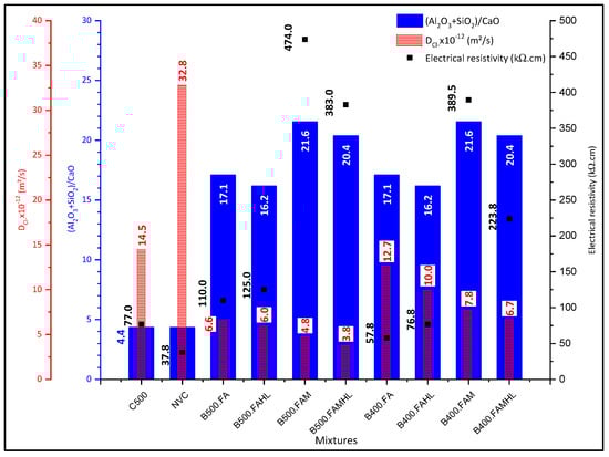 Concrete resistivity is also strongly affected by the type of pozzolan presented in the systems (Figure 6). The presence of metakaolin and fly ash and consequently the alumina content in the SCC resulted in low corrosion risks for the systems regardless of the amount of cement. The presence of HL did not result in a constant behaviour in all SCCs. When HL was used together with metakaolin, the resistivity decreased. When there was no metakaolin in the system, as is the case in binary mixtures B500.FA and B400.FA, resistivity increased, as shown in Figure 7. Thus, the use of mineral additions to obtain reduced-cement-content SCCs (150 and 200 kg/m3) instead of reference ones (300 and 500 kg/m3) did not decrease the resistivity of the concretes. On the contrary, all the binary, ternary, and quaternary blends, independent of binder content, showed bigger resistivity than the reference ones (C500 and NCV). In general, the 5% of hydrated lime addition was positive concerning resistivity.