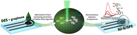In this study, the feasibility of a one-step modification of commercially available screen-printed electrodes (SPE) via laser-induced synthesis in DES is explored. Laser-assisted pyrolysis allows for in situ modification, resulting in more uniform distribution and improved adhesion of the modified layer to the electrode surface compared to traditional techniques such as drop casting [33]. This approach effectively addresses critical challenges in electrochemical sensors, particularly in terms of reproducibility and reliability. Nickel nanoparticles synthesized by this method exhibit excellent electrocatalytic activity in the electrooxidation of dopamine-to-dopamine quinone [34] while providing a cost-effective alternative to noble metals. Furthermore, the incorporation of graphene into the composite system is expected to improve the overall performance of the synthesized electrode by exploiting the synergistic effects of different nanomaterials [35]. The initial DES composition was adapted from our previous works, which were aimed at the synthesis of conductive continuous metal patterns [23,36]. The DES, composed of choline chloride (ChCl) and tartaric acid with dissolved nickel acetate (the molar ratio of these components was maintained at 1:1:1) and dispersed graphene, was drop-cast onto the surface of SPE and scribed using a 532 nm continuous-wave laser. The fabrication scheme for Ni-G/SPE is shown in Figure 1. The experimental parameters were optimized using the Nelder–Mead method, which significantly reduced both time and consumable costs, thus supporting the sustainability of the research. The sensor activity of this composite toward dopamine, as a model biogenic amine, was investigated. The analytical characteristics were evaluated using voltammetric techniques, including cyclic voltammetry (CV) and differential pulse voltammetry (DPV). The ability of the sensor to detect dopamine over a broad linear range with high sensitivity and low detection limits is demonstrated by the study, proving the potential of laser-assisted DES synthesis in the development of advanced electrochemical sensors.