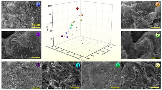 Nelder–Mead optimization of the Ni-G/SPE electrode electrochemical performance (maximal current) through variation in laser power and graphene concentration. Representative SEM images of the Ni-G/SPE samples synthesized in simplex vertices (differently colored points 1–8 on the central graph) at different values of laser power and concentration of graphene dispersion in DES.