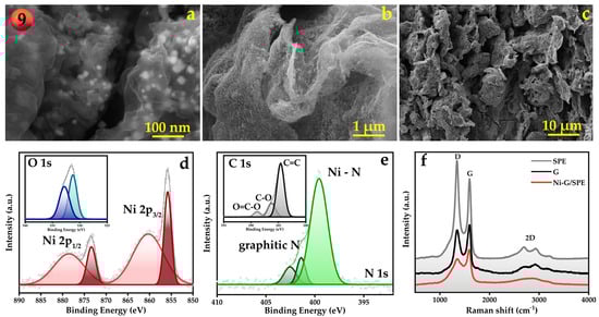 SEM images showing the morphology of the optimized Ni-G/SPE electrode (Sample 9) visualized at different magnifications (a–c), X-ray photoelectron spectra of the Ni 2p and O1s (d), N 1s and C 1s (e) regions as well as Raman spectra of SPE and Ni-G/SPE electrodes, graphene dispersion (f).