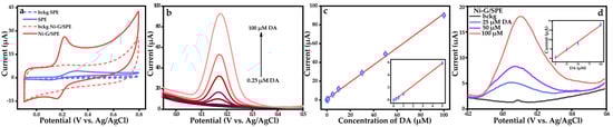 (a) CV curves of SPE and Ni-G/SPE in 0.1 M PBS without additives (dashed line) and in the presence of 50 μM DA (solid line), (b) DPV of the Ni-G/SPE electrode measured with the addition of various concentrations of DA, (c) Correlations of DA oxidation currents with respective concentrations, (d) DPV of the Ni-G/SPE in small volume samples (insert: Correlations of DA oxidation currents with respective concentrations).