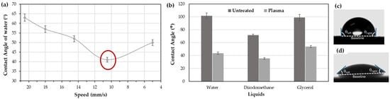 26]. Prior to measurement, the samples were placed in an isothermal chamber at (24 ± 2) °C, pre-saturated with vapor of the corresponding liquid for at least 10 min. Liquid drops were deposited on the surface, and the contact angle was recorded within 1 min of application.