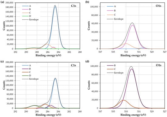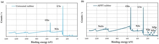 The surface chemical composition of the rubber was investigated using X-ray photoelectron spectroscopy (XPS), both before and after plasma treatment. An ellipsoid scan probe with a major diameter of 400 μm, calibrated with the carbon peak (C-C/C-H, 284.6 eV), was employed for the analysis. XPS measurements were performed on a Kratos XSAM 800 spectrometer (Kratos Analytical Ltd., Shimadzu Group, Manchester, UK) in fixed analyzer transmission mode, with excitation provided by Mg Kα (1253.6 eV). Survey spectra were acquired in the kinetic energy range of 0–1300 eV, with 0.5 eV increments. High-resolution photoelectron lines of key elements, including O1s, N1s, C1s, and S2p, were recorded with 0.1 eV steps. It should be noted that XPS primarily analyzes the surface composition, as it probes a depth of approximately 10 nm.