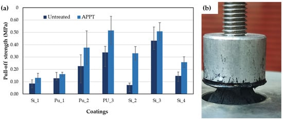 29]. The adhesion performance of the coating was compared between untreated rubber and rubber treated with APPT. The coating itself serves as an adhesive for bonding with the dolly. The dollies had a diameter of 20 mm, and the load values (N) provided by the machine were converted to tensile stress values (MPa). The treatment for the dollies involved cleaning, sanding, and the application of Sikaprimer