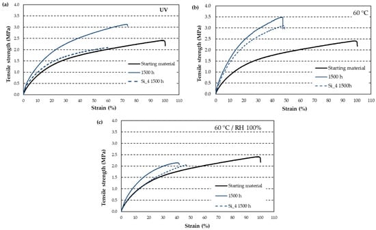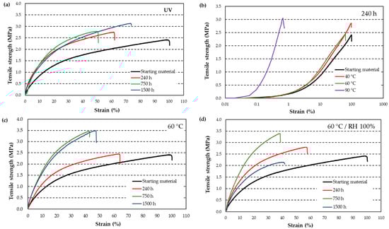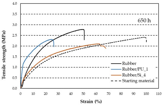 In styrene–butadiene rubber (SBR), thermo-oxidative aging (50–100 °C for 7–60 days) exhibited similar trends. Aging reduced mechanical properties and molar mass between crosslinks, while increasing crosslinking density and hardness. Chemical changes, detected by ATR-FTIR, were predominantly caused by thermo-oxidation, especially at higher temperatures and longer exposure. A threshold molar mass indicated complete degradation, while time–temperature equivalence modeling effectively predicted stress and strain at break [