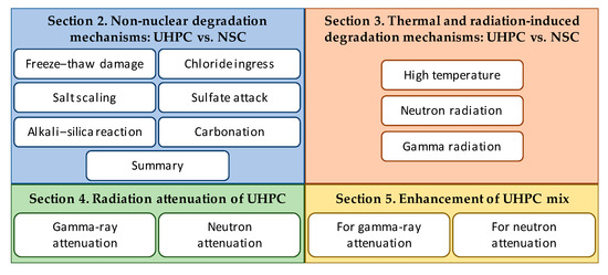 Based on the above, the evaluation of potential degradation mechanisms in typical SNF dry storage systems during the design process is crucial to ensure their long-term performance since preventing material degradation (see Figure 1 and Figure 2 for examples) can significantly extend the service life. The overall goal of this study is to demonstrate the viability of UHPC as a long-term solution for future nuclear storage facilities. As such, the specific objectives of this comprehensive review research are the following: (1) identify the potential degradation mechanisms and their underlying causes as well as their effects for concrete structures in dry cask storage systems; (2) synthesize and assess UHPC performance under the identified aging and degradation effects in comparison to conventional concrete; and (3) identify the knowledge gaps in understanding the behavior of the UHPC material under the discussed effects and potential mixture modifications for future research and development. The discussion is divided into four major sections. The first two sections (Section 2 and Section 3) focus on the general environmental non-nuclear degradation mechanisms as opposed to the more nuclear-specific thermal and radiation-induced degradation. Next, because concrete structures in cask systems are used for both structural integrity as well as radiation shielding, Section 4 and Section 5 review the emerging literature on UHPC radiation attenuation and the possible concrete additives and modifications to improve both gamma and neutron radiation shielding performance. The paper concludes with proposed theoretical UHPC mix adjustments for future SNF storage facilities; however, the results can inform larger concrete applications in NPPs. Figure 3 presents a diagram of the paper structure.