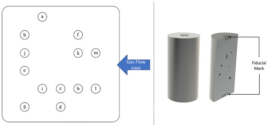 (Left) Specimen layout on the build platform; (Right) cylindrical sample with fiducial marking.