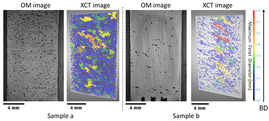 Optical microscopy (OM) image of the polished cross-sections and X-ray computed tomography (XCT) reconstructions of lack of fusion (LOF) porosity: gray represents the bulk material, and the pore Feret diameter is indicated by colors; the scale bar corresponds to 4 mm, representing the sample size; the color bar represents the maximum Feret diameter of the pores; and the arrow represents the build direction (BD).