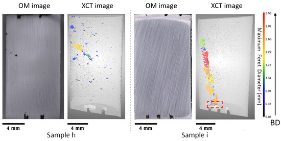 Near-dense samples were subjected to progressively higher levels of laser power and velocity compared to the LOF samples. As the process parameter shifts in the optimal process window, dense samples are expected to be manufactured. Thus, we can observe the highest density in Samples h and i (99.88% and 99.75%, respectively). Although these samples initially looked near fully dense from the OM image (Figure 4), an additional defect was observed in these samples when observed through XCT. These defects originate either from the fiducial marking or from the inside of the sample.