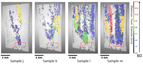 XCT 3D reconstruction of the samples processed with high power–velocity parameters leading to porosity induced by balling, as discussed in Section 3.1.3. In XCT reconstruction: gray represents the bulk material, and the pore Feret diameter is indicated by colors; the bottom fiducial mark (marked in red) indicates the suspected origin of porosity defects; the scale bar corresponds to 4 mm, representing sample size; the color bar represents the maximum Feret diameter of the pores; and the arrow represents the build direction (BD).