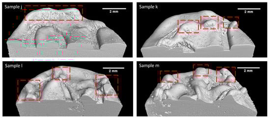 Li et al. [22] investigated the balling formation in the single-track LPBF of SS316L. Their research suggested that oxygen content, laser power, and scan speed play a significant role in ball formation. Based on the findings, the authors suggested that maintaining laser power at 190 W and printing speed at 600 mm/s leads to the occurrence of balling with a rough surface. Gunenthiram et al. [44] also investigated the phenomenon of balling in LPBF SS316L. The researcher’s findings indicate that balling can be attributed to insufficient wetting with the substrate, which can be observed when maintaining a laser power of 159 W and a velocity of 600 mm/s. Moreover, increasing the scanning velocity leads to the occurrence of powder spatter, hence facilitating the formation of surface roughness. The process parameters for Sample j are 230 W and 657 mm/s, which is printed with a higher power and velocity compared to the studies of Li et al. [22] and Gunenthiram et al. [44]. As such, it is more likely to undergo an increase in spatter, rough surface, and insufficient wetting during the printing of this sample. Sample j suffered from a hump, which can be easily seen in the top layer of the printed part (see Figure 6, representing an XCT reconstruction of the surface of the sample). Based on the 3D rendered image of this sample, it can be inferred that the observed sample process parameter was situated in close proximity to the dense-balling process window since there is a presence of significant humps. Thus, it is reasonable to anticipate the occurrence of balling defects in the remaining samples of k, l, and m as a result of increased power and velocity given that their respective processing parameters are in the high-power and high-velocity region.