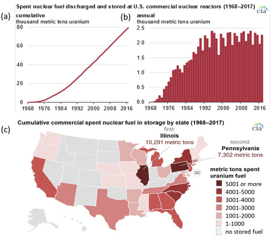 Figure 2a,b shows the cumulative SNF and annual SNF storage at the interim storage location. The data demonstrate that the volume of SNFs generated from the nuclear power plants in the US has continuously increased in recent decades. The cumulative storage of SNFs between 1968 and 2017 corresponding to each US states is shown in Figure 2c. These data report that Illinois and Pennsylvania store more than 175,000 metric tons of SNFs. During storage, DSCs exposed to a chloride-rich environment experience the formation of chloride-laden deliquescent brines on their surfaces, leading to chloride-induced stress corrosion cracking (CISCC).