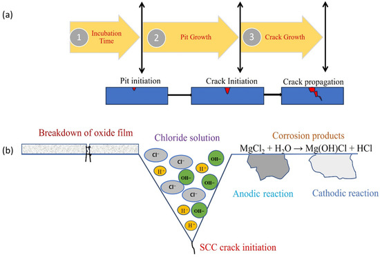 Mechanism of CISCC process: (a) stages depicting the progression from pit initiation to crack propagation; (b) close-up view highlighting the initiation of SCC. Reproduced with permission from [39].