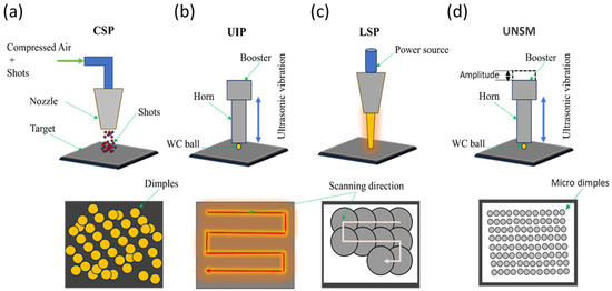 The schematic of the peening process (a) CSP, (b) UIP (c) LSP, and (d) UNSM.