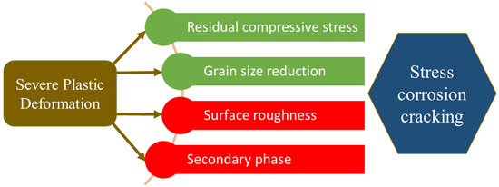 The output parameters of the SPD process can positively or negatively affect the CISCC resistance. The positive factors include RCS and refinement of grains. The synergistic effect of these two factors enhances the CISCC resistance. Refined grains have higher CISCC resistance than their coarse counterparts [17,43]. The evolution of RCS and refined grains can reduce the stress corrosion sensitivity index. Thus, the stress intensity factor reduces, and the RCS in the surface-modified region makes crack propagation difficult [44]. The negative factors include surface roughness and phase transformations [45]. The surface roughness leads to stress concentration and provides conducive crack propagation conditions [46]. The presence of second-phase formation during SPD leads to the selective dissolution of one of the phases and provides an easy path for crack propagation [45,47]. The most influential parameters that oppose/support the CISCC resistance are shown in Figure 5. Hence, careful selection of appropriate parameters during these peening processes is paramount.
