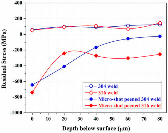 Residual stress distribution in the SS 304 and SS 316 weld joints and weld joints that underwent MSP. Reproduced with permission from [51].