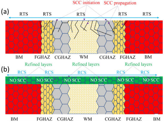 In conclusion, the RTS induced on the weld joint surface by the thermal effects of LSPwC do not adversely affect the SCC performance of the weld joint. This is because the mechanical effects of LSPwC generate a work-hardened layer beneath the surface, enhancing the material’s mechanical properties and contributing to improved overall performance. Irizalp et al. [88] also reported similar effect during LSPwC on ASS. The crack inhibition mechanism after LSPwC on the SS 304L weld joint is indicated in Figure 13a,b.