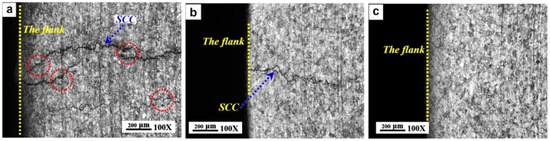 Optical microscopy images of the flange side of the U bend (a) showing CISCC failures in the first type of U bend (b) showing CISCC failures in the second type of U bend, and (c) no CISCC failure in the third type of U bend. Reprinted with permission from [76]. Copyright 2012, Elsevier.