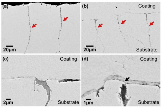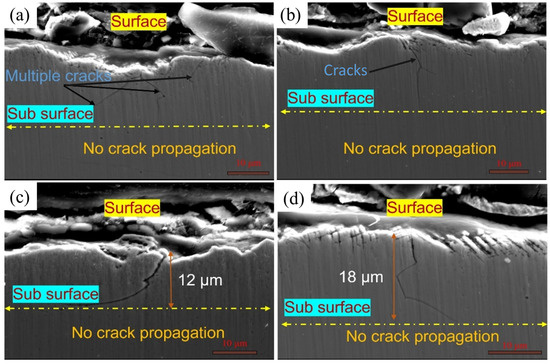 Recently, most works focus on the LSPwC. The LSPwC is a thermo–mechanical coupling process that provides superior surface strengthening and surface hardening compared to LSP [80]. In LSPwC, there is a competition of thermo-mechanical effects during each pulse. However, it is still debated how LSPwC influences the resistance to CISCC. Lu et al. [81] observed RCS on the peened surface of SS 304L following LSPwC, a finding corroborated by Prabhakaran et al. [82]. In contrast, experiments conducted by Nataraj et al. [83] on SS 304L using LSPwC revealed RTS on the surface, with RCS confined to the subsurface region. This phenomenon is further elaborated by Praveenkumar et al. [84]. Therefore, there is a growing need to understand how the RTS on the surface and RCS in the subsurface interact with SCC. To understand the effect of the type of stress on CISCC resistance on the SS 304L that underwent GTAW, LSPwC experiments were conducted [39]. Their studies revealed the occurrence of RTS on the surface of the weld joints. During LSPwC, the interaction between the laser and the substrate results in the formation of an oxide layer and the development of RTS on the surface. These surface RTS are attributed to the effects of laser ablation. Following the LSPwC process, the treated region undergoes cooling and contraction, with the surrounding material constraining this contraction. As a result, RTS are developed on the surface. The RTS was present only up to a few µm, and the material that underwent LSPwC had the RCS to appear below 25 µm 50 µm. The RCS on the subsurface region arise from the synergistic mechanical effects of shock wave propagation, which induces non-uniform plastic strain and minimizes laser ablation [85]. The SCC studies on the U bends subjected to LSPwC showed cracks after approximately 118 h of testing. However, the U bends were tested up to 300 h to see if the subsurface RCS is capable enough to prevent the crack propagation into the bulk of the specimen. Multi-branch cracks were observed whose length varies from 10 µm to 20 µm. However, these cracks were not able to propagate into the bulk of the specimen. This is due to high-magnitude RCS in the subsurface region and grain refinement. The SEM images of the crack and its propagation are shown in Figure 12a,b. Cracks of different dimensions are shown in Figure 12c,d.