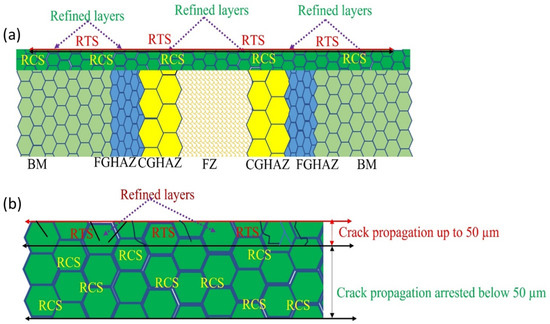 Mitigation mechanism of CISCC (a) showing RTS on the surface and RCS in the subsurface regions, and (b) magnified view of the refined layer. Reproduced with permission from [39].