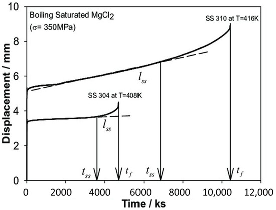 A constant load test for SCC involves the application of a constant tensile load to a specimen while immersing the specimen in a corrosive environment. The testing is carried out to allow for the cracks to initiate and propagate. By monitoring the time to failure at the specific load, the material’s susceptibility to SCC is evaluated. In the constant load method, both the time to failure and elongation can be precisely measured; however, these tests require a significant amount of time to assess the susceptibility to SCC. The constant load method has been widely employed to study the SCC behavior of ASSs, focusing on factors such as applied stress, anion concentration, test temperature, and pH. It was observed that the steady-state elongation rate (Iss) derived from the corrosion elongation curve serves as a key parameter for predicting the time to failure [89,90]. The steady-state elongation rate is the slope of the linear portion of the curve representing the stable crack propagation phase. This parameter is essential for comparing the SCC behavior of various materials or under different environmental conditions. A higher steady-state elongation rate signifies faster crack propagation. The corrosion elongation curve for 304 steel and 310 steel at 408 K and 416 K, respectively, under a constant stress condition (σ = 350 MPa) in boiling saturated MgCl2 is shown in Figure 14. The three parameters that can be obtained from the curve is Time to failure (tf), steady-state elongation rate (Iss), and transition time (ts), where ts is the time at when the elongation curve begin to deviate from a linear increase [5].